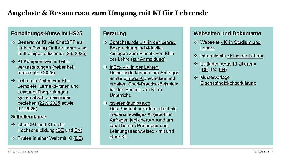 Zudem hat die Universität Basel im Intranet eine Infoseite für Dozierende zum Umgang mit KI-basierten Tools in der Hochschullehre sowie bei schriftlichen Arbeiten eingerichtet. Zugang erhalten Sie über das Netzwerk der Uni Basel (von extern via VPN einloggen) und mit Ihrem Unibas-Login. Falls Sie Fragen zum Umgang des IBW mit KI bei schriftlichen Arbeiten haben, wenden sie sich bitte an bildungswissenschaften@clutterunibas.ch.